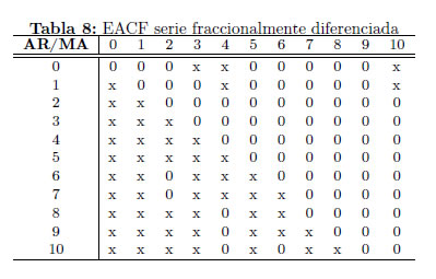 Sobre la serie fraccionalmente diferenciada (Wt) se utilizan las técnicas tradicionales de identificación de un modelo ARMA(p,q) para la componente a corto plazo. Siguiendo el lineamiento de Tiao y Box (1981), Wei(2006) y Cryer (2008) para la identificación de los órdenes p y q de un modelo ARMA(p,q) se presenta el resultado de la función de autocorrelación extendida (ESACF) sobre la serie fraccionalmente diferenciada (Ver Tabla 8). En general, para un proceso ARMA(p,q) el vértice de un triángulo de ceros en la ESACF asintótica estará en la posición (p,q). En la Tabla 8 se observa el mencionado vértice en la posición (2,2) lo cual indica que proceso ARMA(2,2) es consistente para modelar el comportamiento de corto plazo de la serie transformada fraccionalmente diferenciada. Empleando los criterios de selección de modelos AIC y BIC se obtuvo el mismo modelo.