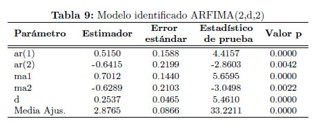 En la Tabla 9 se resume el ajuste del modelo identificado y la estimación del parámetro de diferenciación fraccional d.