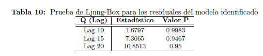 Los resultados presentados en la Tabla 10 permiten concluir que no hay correlación serial en los residuales del modelo ARIMA(2,d,2) identificado. Lo anterior indica que el modelo ARMA(2,2) es adecuado para capturar la correlación serial a corto plazo presente en la serie fraccionalmente diferenciada.