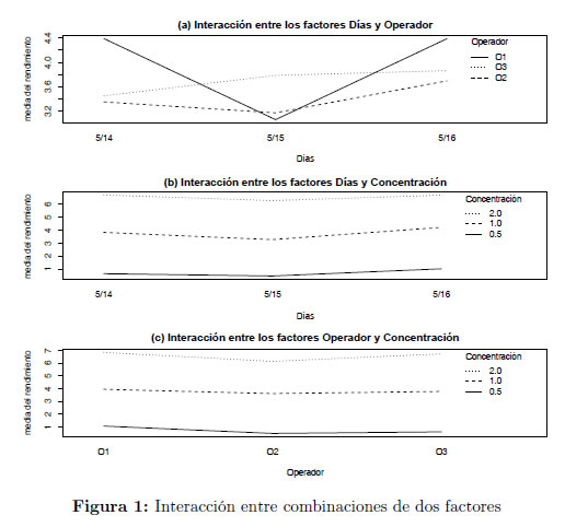 A continuación se presenta un ejemplo de un diseño factorial 33, citado por Melo, López y Melo [24] y estudiado por Méndez [25]. En una planta industrial se estudió el efecto de los factores días, operadores y concentraciones de solventes en el rendimiento de la planta. Días y operadores eran efectos cualitativos y las concentraciones fueron 0.5, 1.0 y 2.0, que aunque no son igualmente espaciadas, sus logaritmos si son igualmente espaciados, y éstos se usan si se desea observar la forma de la respuesta a través de este factor.