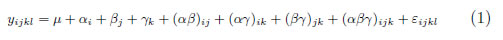 donde i=1,2,3, j=1,2,3, k=1,2,3, l=1,2,…n, las yijkl son las respuestas al tratamiento ijk-ésimo en la replicación l-ésima, con n replicaciones de cada tratamiento, μ es un parámetro común a todos los tratamientos denominado media global, αi es un parámetro del i-ésimo nivel del factor A, βj es el parámetro del j-ésimo nivel del factor B, γk es el parámetro del k-ésimo nivel del factor C. Los términos en paréntesis son los respectivos efectos de la interacción entre los diferentes niveles de los tres factores y εijkl es la componente aleatoria del error, la cual se supone normal con media cero y varianza constante σ2.