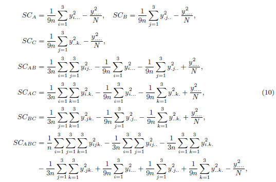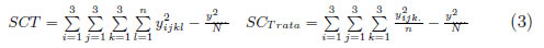 donde n es el número de repeticiones dentro de cada tratamiento, yi…2 es el cuadrado del total de los datos sobre el nivel i del factor A, y.j..2 es el cuadrado del total de los datos sobre el nivel j del factor B, y..k.2 es el cuadrado del total de los datos sobre el nivel k del factor C, yij..2 es el cuadrado del total de los datos sobre los niveles i y j de la interacción AB, yi.k.2 es el cuadrado del total de los datos sobre los niveles i y k de la interacción AC, y.jk.2 es el cuadrado del total de los datos sobre los niveles j y k de la interacción BC, yijk.2 es el cuadrado del total de los datos sobre los niveles i, j y k de la interacción ABC y y….2 es el cuadrado de la suma de todos los datos en el diseño. Para mayores detalles de estas sumas de cuadrado véase Montgomery [14]. Bajo estas expresiones, la suma de cuadrados de los errores está dada por: