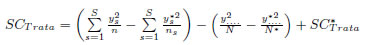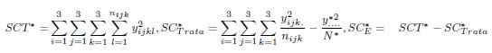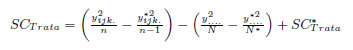 donde (SCTrata) es la suma de cuadrados de los tratamientos y (SCE) es la suma de cuadrados del error. La forma usual de calcular dichas sumas está determinada por: