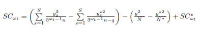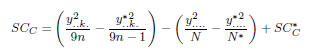 El primer termino corresponde a la diferencia de la suma de los totales de los S tratamientos donde se encuentran distribuidas las observaciones influyentes, elevados al cuadrado y dividido por el número de observaciones en ellos; y la suma de los totales de los mismos S tratamientos, pero en el modelo desbalanceado. Esta diferencia es corregida por el efecto de las observaciones sobre los totales del modelo. El subíndice t=1,2,…,ω denota el factor al que se hace referencia.