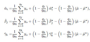 Las estimaciones de los parámetros del modelo planteado en (1) están dadas en términos del promedio general, de los promedios de los tratamientos y de las interacciones entre los mismos [23]. Los estimadores para los parámetros del modelo desbalanceado se calculan de igual forma, como se muestra a continuación: