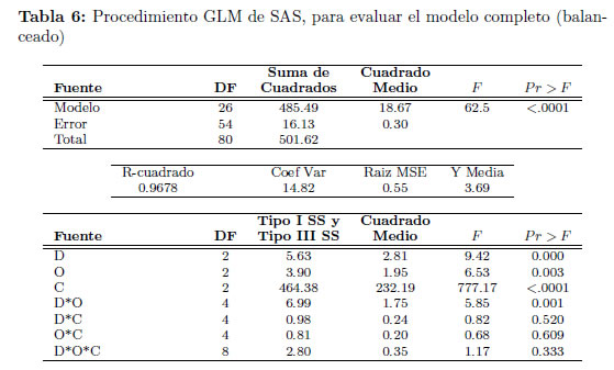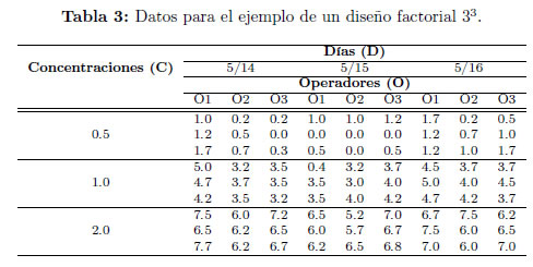 El diseño experimental fue completamente aleatorizado y los factores se consideraron fijos. Se hicieron tres repeticiones de cada uno de los 27 tratamientos. Los datos codificados, a los que se les restó 20 para simplificar los cálculos se presentan en la Tabla 3.