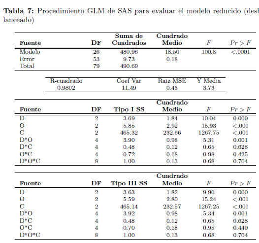 Por otra parte, cabe anotar que las características de los modelos varían significativamente. El modelo balanceado ajustado (ver Tabla 6) tiene un R2=0.9678 y un coeficiente de variación de 14.822, mientras que el modelo desbalanceado ajustado (ver Tabla 7) tiene un R2=0.9801 y un coeficiente de variación de 11.488; lo que indica que el modelo ajustado, excluyendo la influencia, es mucho mejor que cuando ésta se tiene en cuenta.