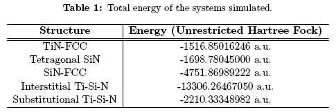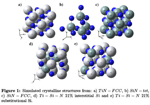 In this paper the influence of the insertion of silicon atoms in the TiN lattice is studied, with the objective of determining the T i − Si − N formation mechanism. The composite simulations were performed using Gaussian 03 software with 6-311G/6-31G databases, Single Point Energy method (SPE), with the unrestricted Hartree Fock approximation to find spin functions and electrostatic multipolar expansion. Local Density A- pproximation (LDA) energy functions were used for short range corre- lations and General Gradient Approximation (GGA) functions for long range. Dummy atoms were included in order to complete the periodi- city of the crystalline lattice and avoid edge discontinuities in the total electrostatic potential. A 1x10−2 convergence values were achieved for the density functions and energy between 150 cycles [17],[18]. Computa- tional time for all the simulations was superior to 12 hours. Obtained data was summarized by Mulliken charge distribution and electron total density mapped to the highest occupied molecular orbital (HOMO). For a simpler representation, 75% of the Van deer Walls radius was used. Ex- perimental studies indicate that Si atoms insertion over 7% increases the probability of nano-composite formation composed of T iN nano-crystals in an amorphous SiNmatrix (nc − T iN/a − SiN) [16], in order to overcome this experimental limit, 21% of Si atoms were inserted to the structures. Simulated structures corresponds to a face center cubic titanium nitride (T iN−FCC), tetragonal silicon nitride (SiN−tet), face center cubic silicon nitride (SiN− FCC), face center cubic titanium silicon nitride with 21% interstitial silicon (T i−Si−N−interstitial) and face center cubic titanium silicon nitride with 21% substitutional silicon (T i−Si−N−substitutional) (Figure 1). Table 1 shows the total energy obtained from the simulated structures.