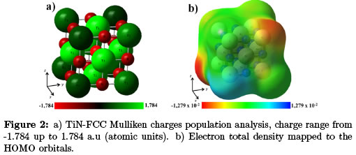 Figure 1a shows TiN-FCC structure simulated, generating an interstitial nitride with lattice parameter of 0.424 nm; the array corresponds to a free stress structure reported by A. Devia et al [19]. This lattice parameter was used for all simulations in order to eliminate intrinsic variations caused by system sintering or deposition [2]. Figure 2a, shows Mulliken charges population analysis for TiN — FCC. The structure showed a neutral, stable behavior (∑q1 = 0) and spatial distribution depends on the element electronegativity. There is a high probability for other compounds to be formed, produced by chemical reactions after material sintering or thin film deposition, such as TiO2 and TiO, Meanwhile nitrogen produces NH2. However, NH2 formation needs more energy, for that reason is expected that nitrogen stabilization is produced by association of N+ ions to N2 [13]. Figure 2b, shows total electron density of the TiN lattice mapped to the highest occupied molecular orbital (HOMO). The surface is continuous with polarizations produced by charge separation, as observed in the Figure 2a. This is agreement with the sp hybridization morphology that have been observed experimentally by X Ray Photoelectron Spectroscopy (XPS) [20]. The charge ranges from −57.72x10−4 up to 57, 72x10−4 a.u, showing symmetry, continuity and stability.