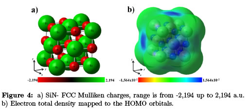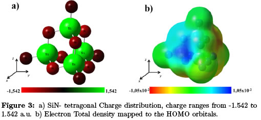 Mulliken population analysis (Figure 3a) shows high polarization due to the high electronegativity of nitrogen atoms that attracts charges; meanwhile silicon atoms shoed reduced charge distributions. However the structure is stable (∑q1 = 0). High polarization of the atoms in the structure could indicate a polar bond between the elements; nevertheless orbital formed strongly indicates a covalent bond formation that has been confirmed both theoretically and experimentally [11],[13]. Figure 3b shows SiN-Tetragonal electron total density mapped to the HOMO orbitals. As discussed above, an intrinsic polarization due to compound ceramic characteristics is observed. This phenomenon stabilizes with lattice expansion as studied by R.F. Zhang et al [11] and E.V. Shalaeva et al [13]. Charge range from —1:05x10—2 to 1:05x10—2 a.u.