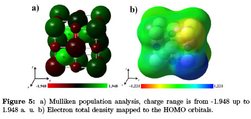 SiN − FCC simulated structure is shown in the Figure 1c. Mulliken charges population analysis (Figure 4a) showed a complete system pola- rization with high instability for the phase formation; however Mulliken charges sum is equal to cero [1]. High values in the change population analysis could indicate the absence of Si − N bonds, tending to increase in energy with the number of atoms in the system as observed from Table 1, leading to instability for the 6 coordination number of the FCC struc- ture. As the Mulliken population analysis explicitly depends on the basis set choice, the use of two different data bases reduced the uncertainty and comparable results were obtained [25]. Si−Si or N −N bond creation was discarded, indicating lateral compound formation after sintering; resulting in oxidation to SiO and SiO2. The tetragonal SiN structure is predominant at the nano-composite interface. Control in the formation of lateral compounds will improve adherence between the matrix and the nano-grain [13]. Total electron density mapped to the HOMO orbitals (Figure 4b), shows polarization in the total density surface, this instability is related to absence of charge compensation on the center of the face. Charge ranges from −1.564x10−2 to 1.564x10−2 a.u.