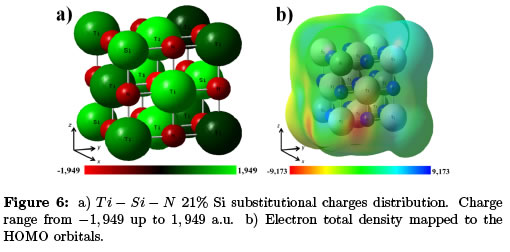 The electron total density (Figure 6b) is continuous. There is an im- probable orbital overlap in the left front corner, generated by electrons in the titanium atom, due to the location of silicon in the vicinity. The same phenomenon is observed in all the titanium atoms near the silicon but to a lesser extent. In general, the structure is stable, but low formation proba- bility is observed, due to T i − Si bond formation and T i − N and Si − N bond destruction. It is possible that lateral structures are formed, as α ,β or γ (cubic) SiN and α and β T iN or other phases of the compound (α, β, α−βTi−Si−N) in meta-stable equilibrium [13]. Charge range from −9, 173x10−3 to 9, 173x10−3 a.u.
