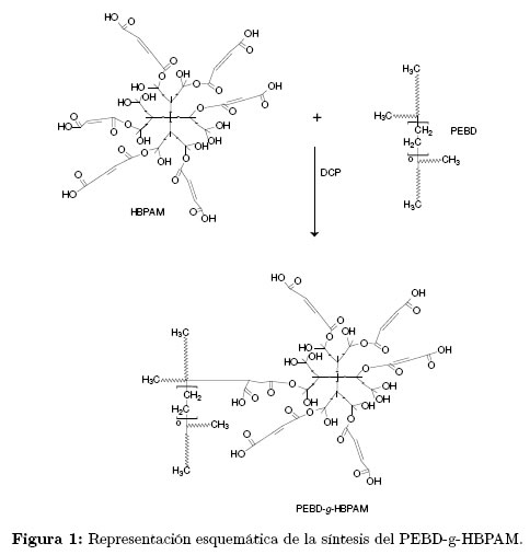 Una reacción colateral que se lleva a cabo durante la funcionalización del PEBD con AM es el entrecruzamiento entre las cadenas del PEBD, esto reduce la formación de radicales del AM y el injerto de este en el PEBD [5],[6] . Los poliésteres polioles altamente ramificado presentan alto empaquetamiento estructural, un gran número de grupos funcionales en su periferia, baja viscosidad en solución y en fundido [7],[8], bajo grado de enredamiento molecular [9]. Además por modificación de los grupos funcionales se pueden obtener materiales con propiedades y aplicaciones específicas [10].