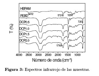 La Figura 3 muestra los espectro IR del HBPAM, PEBD y los PEBDg- HBPAM . En el espectro infrarrojo del HBPAM se observa una señal a 3412 cm−1, la cual corresponde a la absorción del estiramiento de los grupos OH, a 2946 y 2870 cm−1 aparecen dos absorciones debidas al estiramiento del enlace C-H, la señal a 1731 cm−1 es atribuida a grupos carbonilo de ésteres, la señal a 1632 cm−1, es atribuida a la absorción de dobles enlace carbono-carbono (−C=C−). La señal a 1230 cm−1 es asignada a vibraciones de estiramientos de enlace C-O de grupos esteres o éteres.se observa una señal. En todos los espectros de las muestras purificadas de PEBDg- HBPAM, se observó la absorción de grupos OH, -CH=CH- y la de los grupos ésteres; estas señales están presentes en el espectro del HBPAM, pero ausentes en el espectro del PEBD, lo cual indica que en todos los casos el PEBD fue modificado con el HBPAM. En el caso de la absorción de grupos OH (3412 cm−1), se puede observar que la muestra DCP1.5 presentó una mayor intensidad. La muestra DCP0.5, presentó la menor intensidad de la absorción de grupos ésteres (1731 cm−1). De acuerdo a los resultados obtenidos del análisis IR, se puede concluir que en todos los casos se llevó a cabo la funcionalización del PEBD con el HBPAM.