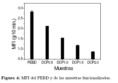 PEBD funcionalizado con ácido acrílico, conteniendo un 6.0% de ramificaciones de éste, presentó un valor de MFI de 2.0 g/10 min [21]. Éste valor solo es superior para la muestras DCP1.0 (1.54 g/10 min.), DCP1.5 (1.17 g/10 min.) y DCP2.0 (0.87 g/10 min.), pero es menor que el de la muestra DCP0.5, cuyo valor de MFI fue de 2.12 g/10 min. La diferencia con los resultados obtenidos en este estudio radica en que durante la funcionalización pueden ocurrir reacciones de entrecruzamiento a través del AM injertado y/o del PEBD, lo cual reduce el MFI.