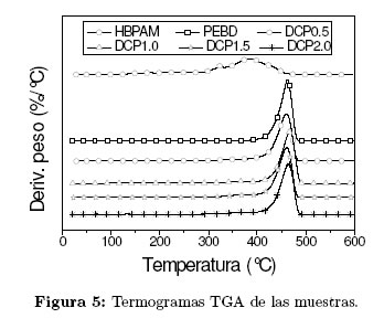 Las muestras de PEBD funcionalizadas con AM (DCP0.5, DCP1.0, DCP1.5 y DCP2.0), presentaron mayor temperatura de descomposición (Td) que el PEBD (Tabla 1). Además, los valores de Td de las muestras funcionalizadas fueron muy similares y no se observó una tendencia marcada con el contenido de DCP o el grado de injerto del HBPAM, lo cual posiblemente se debe a la presencia de reacciones de entrecruzamiento entre las cadenas y al grado de entrecruzamiento de estas, las cuales pudieron ocurrir a través del HBPAM injertado o de las cadenas del PEBD.