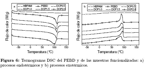La Figura 6 presenta los termogramas de DSC del, HBPAM, PEBD y las muestras funcionalizadas (Figura 6a y 6b). En la Figura 6, se puede observar que el HBPAM solo exhibió una Tg, lo cual indica que este material es amorfo.
