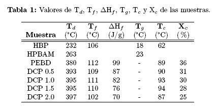 Los resultados del Xc (Tabla 1) permiten evidenciar una vez más que las muestras funcionalizadas presentaron menor cristalinidad que el PEBD. De acuerdo a los resultados obtenidos del análisis DSC, se puede concluir que la cristalinidad del PEBD fue modificada por la funcionalización de éste con el HBPAM y que se presentó una tendencia con el incremento en la concentración de DCP empleado.