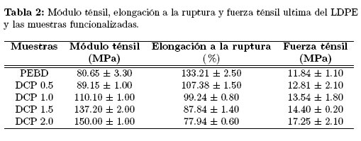 La Tabla 2 presenta las propiedades mecánicas del PEBD y de las muestras funcionalizadas. El módulo ténsil y la fuerza ténsil última de las muestras funcionalizadas fueron mayor que el del PEBD, y éstos en las muestras funcionalizadas, incrementaron sistemáticamente con el grado de funcionalización y de DCP empleado; esto es atribuido al aumento de las interacciones a través de puentes de hidrógeno y al incremento del grado de entrecruzamiento. El comportamiento mostrado por la elongación fue opuesto al exhibido por el módulo ténsil y la fuerza ténsil, lo cual era de esperarse. Los resultados permiten confirmar una vez más que el HBPAM fue injertado en el PEBD.