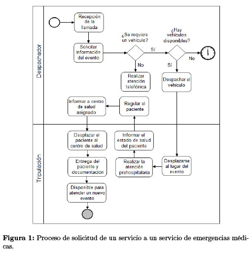 En el proceso de la atención de una emergencia [6], [14] se realizan un grupo de actividades que generalmente inician con la recepción de una llamada y la solicitud de la información necesaria para identificar la necesidad de enviar un vehículo al lugar del evento. Posterior a esto, de ser necesario el envío del recurso (vehículo) se evalúa la disponibilidad y se despacha el vehículo. En esta última actividad, hay algunos criterios posibles para la decisión, por ejemplo, la elección de la ambulancia disponible más cercana o una ''respuesta regionalizada'', la cual consiste en la asignación de un área de servicio específica para cada recurso.