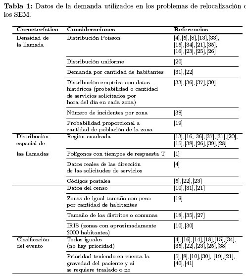 En la Tabla 1 se presenta un resumen de las tres características principales que se tienen en cuenta para representar la demanda en los SEM. Estas características son: la distribución de la llamada, la distribución geográfica y la clasificación del evento.