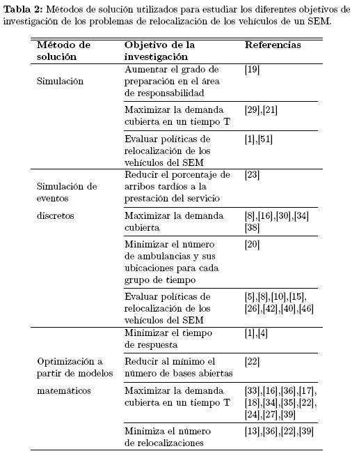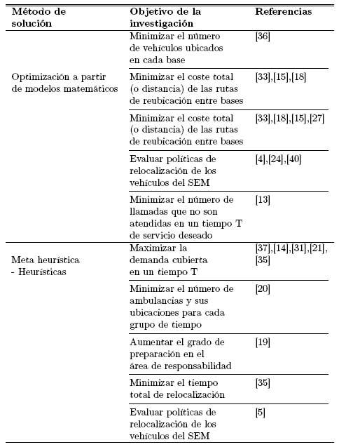 Este artículo se divide en 9 secciones, en la segunda se presenta un resumen del proceso de atención de un SEM y se identifican las etapas en el proceso donde es posible aplicar políticas de relocalización. La forma como se apliquen estas políticas permite clasificar los problemas de relocalización en dos categorías, las cuales también se discuten en la primera sección. En la tercera sección se presentan, los principales componentes que se tienen en cuenta en el diseño de los modelos planteados en torno a esta problemática. En la cuarta sección se identifican los métodos de solución implementados en la literatura para abordar los problemas de relocalización, así como los objetivos de estudio. En la quinta sección se identifican las medidas de desempeño más utilizadas en la evaluación de políticas de relocalización, en la sesta se discuten aspectos relacionados con las estrategias de la recolección de datos, en la séptima se presenta las técnicas de verificación y validación de los modelos y en la octava sección se presentan algunas políticas de relocalización utilizadas en los estudios revisados. Finalmente, en la sección novena se presentan las conclusiones y algunas sugerencias para investigaciones futuras.