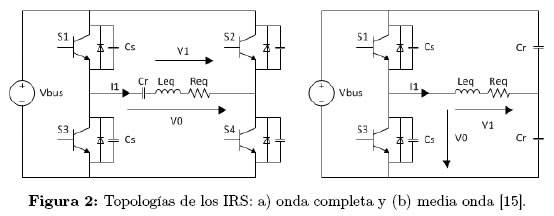 En un estudio realizado por Llorente et al. [16] se comparan las diferentes topologías usadas en los IRS entre onda completa, media onda y dos topologías de un solo interruptor, todas a partir de iguales especificaciones y con los mismos criterios de evaluación. Se encontró que la topología de onda completa fue la más eficiente por generar las menores corrientes por los interruptores de potencia, pero con una implementación compleja y costosa. En las topologías de media onda se encontró un balance más apropiado entre la complejidad, el costo y el desempeño. Las topologías de un interruptor de uso normal de conmutación por voltaje cero (ZVS, Zero Voltage Switching) y conmutación por corriente cero (ZCS, Zero Current Switching) fueron las más simples pero con voltajes mayores, su eficiencia fue baja y su control complejo. Otras comparaciones de factor de potencia, frecuencia de operación y carga variable han sido también desarrolladas por Dawson y Jain [11]. Otros estudios han evaluado también el circuito equivalente de Thévenin [14], [16] y el comportamiento térmico de los IGBT y de los disipadores térmicos para el inversor de media onda [17].