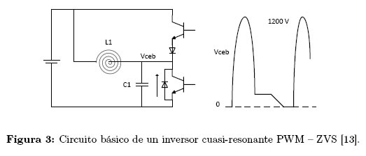 En este inversor híbrido los interruptores de potencia son remplazados por interruptores resonantes. El interruptor resonante es un circuito compuesto por un interruptor de potencia y dos elementos de resonancia Lr y Cr y se clasifican en: interruptores resonantes de corriente cero e interruptores resonantes de voltaje cero. En los interruptores resonantes de corriente cero la inductancia Lr se conecta en serie con el interruptor de potencia para obtener la conmutación por ZCS y puede operar en modo de media onda o de onda completa. Los interruptores resonantes de voltaje cero se presentan cuando el condensador Cr se conecta en paralelo con el interruptor para obtener la conmutación por voltaje cero (ZVS), puede operar en modo de media onda o de onda completa [24]. Wang et al. [13] estudiaron un inversor cuasi-resonante serie con regulación de potencia de salida variable con frecuencia fija y múltiples salidas (múltiples quemadores), conmutación por ZVS y control de PWM. Esta topología fue exitosa con IGBT de conducción inversa y de bloqueo inverso. La Figura 3 presenta un circuito típico de inversor cuasi-resonante (IQR) PWM-ZVS.